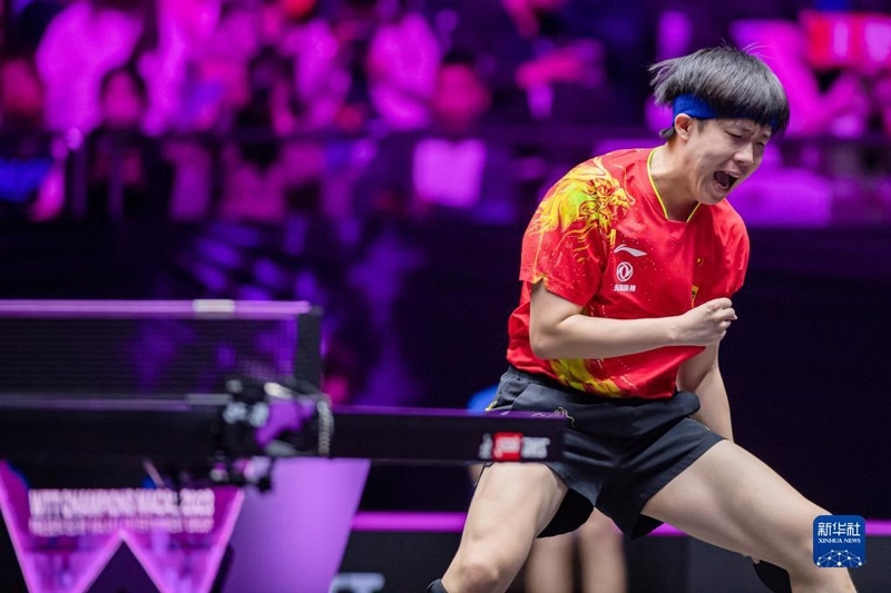 2023年4月23日,王曼昱在比賽中慶祝得分。當日,在澳門塔石體育館舉行的2023世界乒乓球職業(yè)大聯(lián)盟(WTT)澳門冠軍賽女子單打決賽中,中國選手王曼昱以4比2戰(zhàn)勝隊友陳夢,奪得冠軍。新華社記者 張金加攝