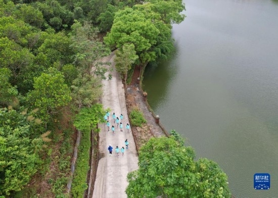 在海南瓊中縣舉辦的中國(guó)足協(xié)女足青訓(xùn)中心“希望杯”U12組比賽的空閑時(shí)段,四川隊(duì)隊(duì)員在賓館內(nèi)部道路跑步(無(wú)人機(jī)照片,4月10日攝)。