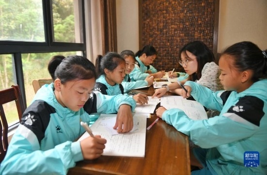 在海南瓊中縣舉辦的中國(guó)足協(xié)女足青訓(xùn)中心“希望杯”U12組比賽的空閑時(shí)段,來(lái)自涼山彝族自治州的四川隊(duì)隊(duì)員舍布么扯鳩莫(左二)和隊(duì)友們?cè)诶蠋煄ьI(lǐng)下學(xué)習(xí)文化課(4月10日攝)。