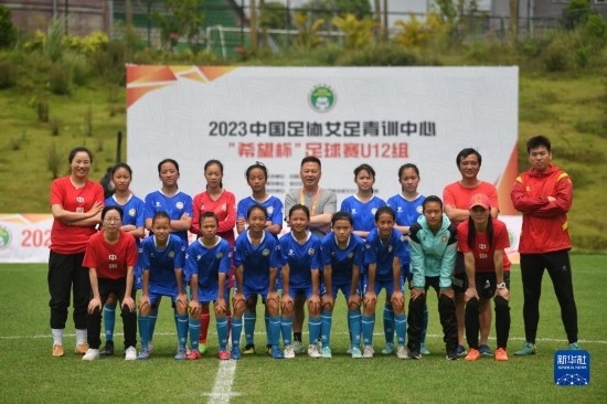 在海南瓊中縣舉辦的中國(guó)足協(xié)女足青訓(xùn)中心“希望杯”U12組四川隊(duì)對(duì)陣廣東隊(duì)的比賽后,四川隊(duì)成員在球場(chǎng)合影(4月10日攝)。