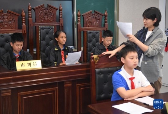在瀘州天立春雨學(xué)校教室,來(lái)自涼山彝族自治州的舍布么扯鳩莫(左二)和同學(xué)們上模擬法庭特色選修課(5月11日攝)。