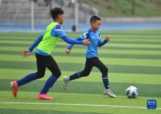 在瀘州天立春雨學(xué)校足球場(chǎng),來(lái)自涼山彝族自治州的金貴坤(右)與隊(duì)友進(jìn)行訓(xùn)練(3月28日攝)。
