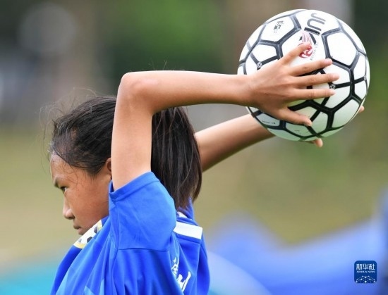 在海南瓊中縣舉辦的中國(guó)足協(xié)女足青訓(xùn)中心“希望杯”U12組四川隊(duì)對(duì)陣廣東隊(duì)的比賽中,來(lái)自涼山彝族自治州的四川隊(duì)球員舍布么扯鳩莫發(fā)邊線(xiàn)球(4月10日攝)。