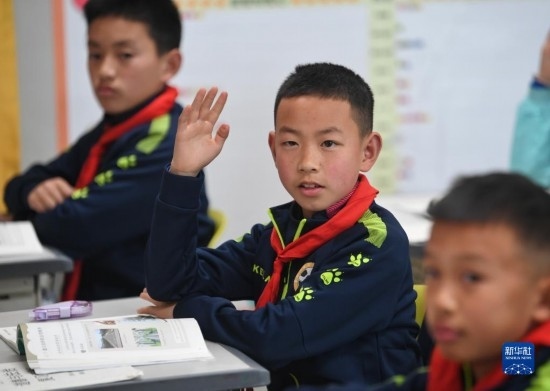 在瀘州天立春雨學(xué)校教室,來(lái)自涼山彝族自治州的金貴坤(中)在課堂上舉手回答老師提問(wèn)(3月28日攝)。