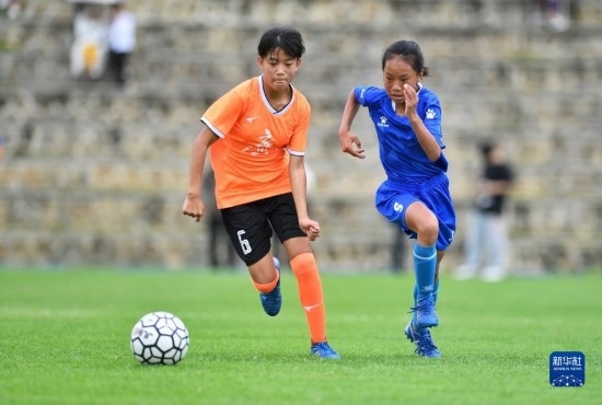 在海南瓊中縣舉辦的中國(guó)足協(xié)女足青訓(xùn)中心“希望杯”U12組四川隊(duì)對(duì)陣廣東隊(duì)的比賽中,來(lái)自涼山彝族自治州的四川隊(duì)球員舍布么扯鳩莫(右)奮力拼搶?zhuān)?月10日攝)。