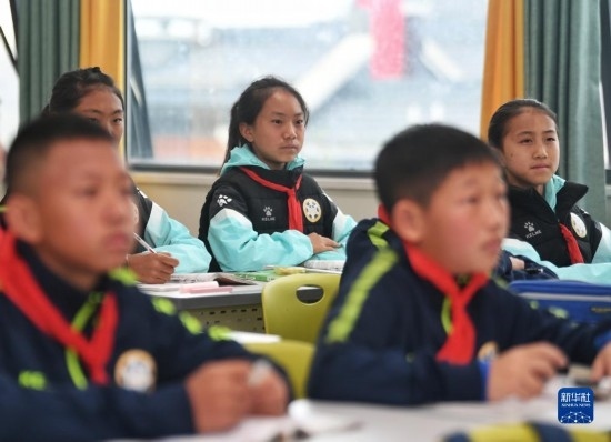 在瀘州天立春雨學(xué)校教室,來(lái)自涼山彝族自治州的舍布么扯鳩莫(中)在課堂上聽(tīng)講(3月28日攝)。