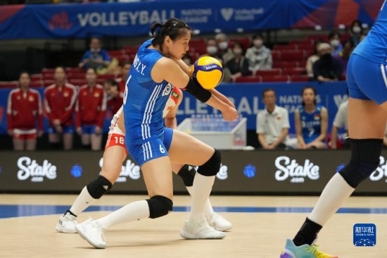 6月2日,中國隊球員袁心玥(中)在比賽中扣球。新華社記者 張笑宇 攝