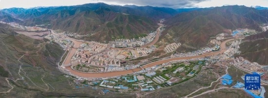 6月22日在國道317線昌都段拍攝的丁青縣尺牘鎮(zhèn)全景(無人機(jī)照片)。