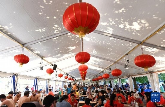 6月25日,在瑞士埃格利紹,人們在賽龍舟活動上品嘗美食。