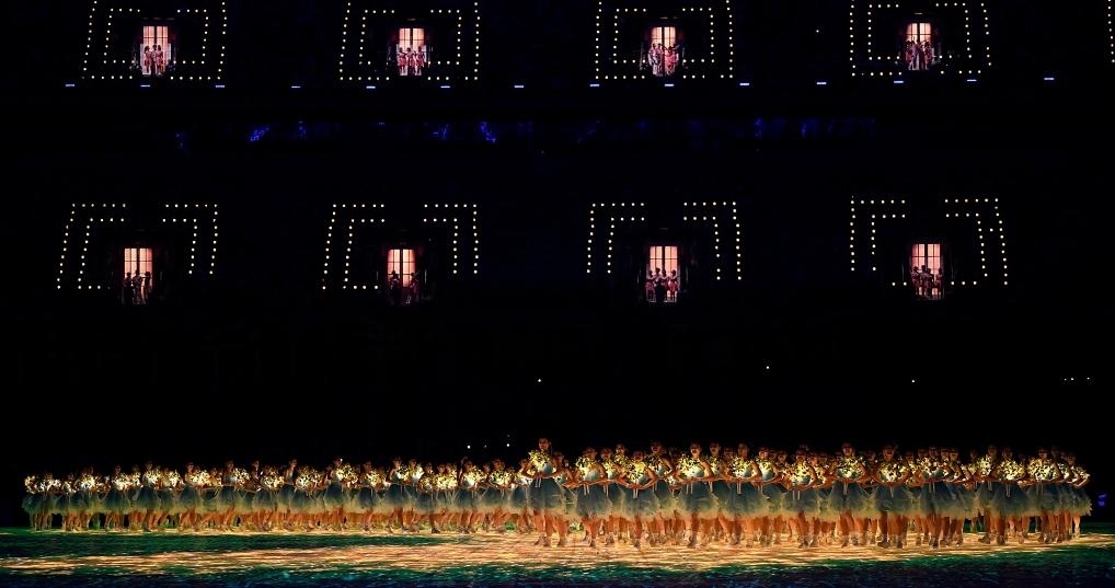 歌聲高潮處,觀眾席中近百扇“幸福之門”同時開啟。全場萬人合唱,現(xiàn)場每一名觀眾都成為開幕式“主角”,傳達“亞洲一家攜手同行”的美好愿望。