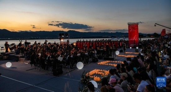 來自昆明聶耳交響樂團及昆明市民族歌舞劇院民樂團的演奏家們在昆明市滇池畔共同演奏包括《義勇軍進行曲》《賣報歌》在內(nèi)的聶耳代表作(7月17日攝)。