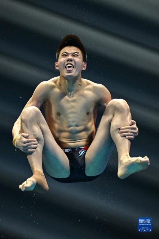 7月18日,中國選手鄭九源在三米板項(xiàng)目比賽中。