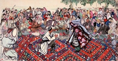 繞過(guò)紅色展墻,黃胄于1962年創(chuàng)作的《豐樂(lè)圖》赫然在目,拉開(kāi)了展覽第一篇章的序幕。花團(tuán)錦簇的地毯上擺滿瓜果,人們圍坐在一起載歌載舞,歡慶豐收。畫(huà)面中的眾多人物雖姿態(tài)各異,但都喜笑顏開(kāi),感染著觀者。作品描繪出熱烈的慶祝場(chǎng)面,富有濃郁的地域特色,是新疆各族人民團(tuán)結(jié)和睦、意氣風(fēng)發(fā)的生動(dòng)寫(xiě)照。