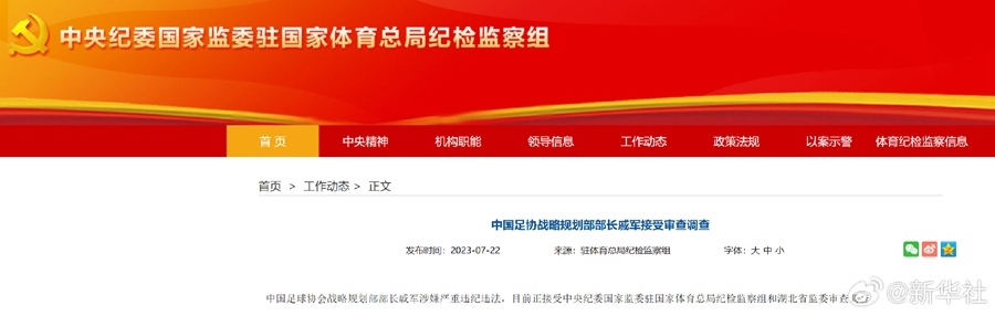 中國(guó)足球協(xié)會(huì)技術(shù)部部長(zhǎng)譚海涉嫌嚴(yán)重違紀(jì)違法,目前正接受中央紀(jì)委國(guó)家監(jiān)委駐國(guó)家體育總局紀(jì)檢監(jiān)察組和湖北省監(jiān)委審查調(diào)查。中國(guó)足球協(xié)會(huì)戰(zhàn)略規(guī)劃部部長(zhǎng)戚軍涉嫌嚴(yán)重違紀(jì)違法,目前正接受中央紀(jì)委國(guó)家監(jiān)委駐國(guó)家體育總局紀(jì)檢監(jiān)察組和湖北省監(jiān)委審查調(diào)查。(中央紀(jì)委國(guó)家監(jiān)委駐國(guó)家體育總局紀(jì)檢監(jiān)察組)