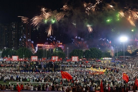 這是7月29日拍攝的“村超”比賽結(jié)束后的焰火表演。新華社記者 劉續(xù) 攝