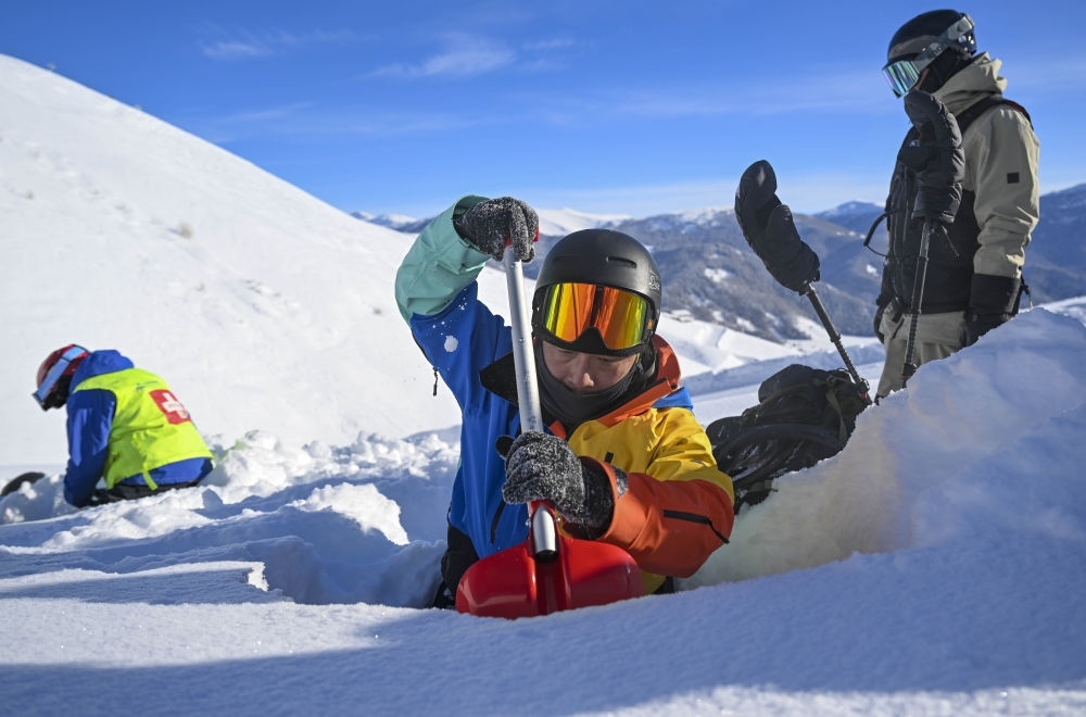 彭超(中)和新疆阿勒泰地區(qū)禾木吉克普林滑雪場救援隊(duì)一起做雪層分析,預(yù)判風(fēng)險保障游客滑行安全。