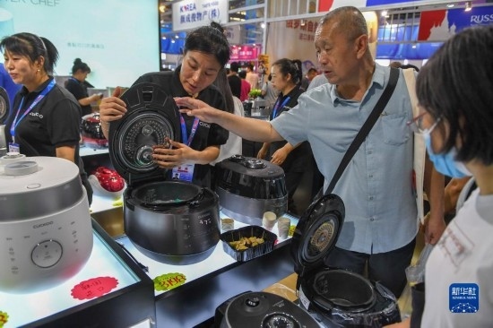 8月23日,在第十四屆中國—東北亞博覽會東北亞商品館,參展商向參觀者介紹韓國電器。