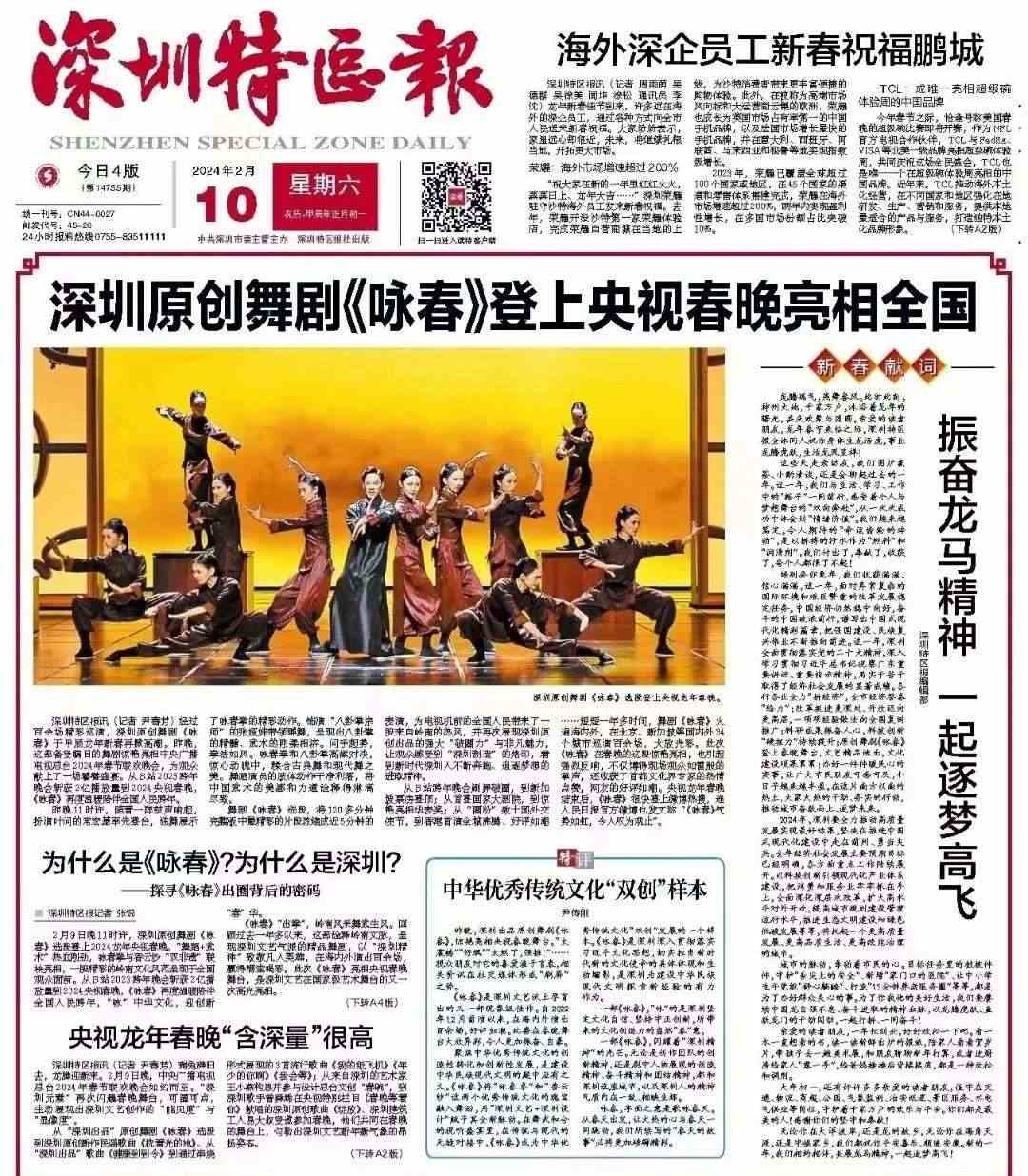 《深圳特區(qū)報(bào)》在大年初一頭版頭條對(duì)《詠春》做了報(bào)道。光明日?qǐng)?bào)原總編輯何東平等首都文化界專(zhuān)家學(xué)者在采訪(fǎng)中紛紛為《詠春》成功登陸春晚大舞臺(tái)而點(diǎn)贊。