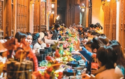 越南游客還品嘗了頗具特色的將軍府凱旋宴。40余張木桌沿街?jǐn)[放,熱氣騰騰的烏鎮(zhèn)特色土火鍋和各色菜品擺滿了桌面,耗兒魚、鮮菌菇拼盤、嫩滑牛肉等美食令人垂涎欲滴,越南游客圍坐在一起,享受美味盛宴。