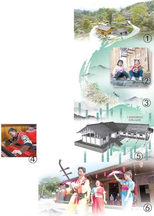 圖①:俯瞰龍鳳壩鎮(zhèn)大寨村。圖②:孩童們坐在龍鳳壩鎮(zhèn)大寨村的古民居前。圖③:大溪鄉(xiāng)前進(jìn)村的臨水風(fēng)光。圖④:在龍鳳壩鎮(zhèn)大寨村,村民正制作土家織錦。圖⑤:土家族傳統(tǒng)民居結(jié)構(gòu)示意圖。張丹峰繪 圖⑥:在溪口鎮(zhèn)黃楊扁擔(dān)村,村民們演唱秀山民歌《黃楊扁擔(dān)》。圖①②③④⑥均為沈靖然、胡程攝影報(bào)道