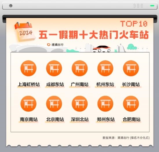 跨城跨省出游帶動下,五一假期前往大型交通樞紐的打車需求環(huán)比節(jié)前上漲73%。從叫車需求量看,上海虹橋站、成都東站、廣州南站等領(lǐng)銜今年五一十大熱門火車站。在相關(guān)主管部門指導下,滴滴在北京、長沙、成都、臨沂、泉州、廈門等地組建保障車隊,在重點場站、景區(qū)等場景,協(xié)助進行出行高峰時段的旅客疏散和轉(zhuǎn)運。