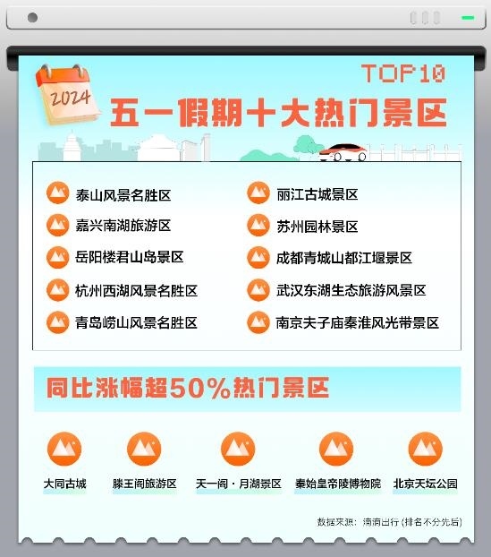 與去年五一相比,大同古城、滕王閣旅游區(qū)、天一閣·月湖景區(qū)、秦始皇帝陵博物院、北京天壇公園等景區(qū)今年打車需求火熱,同比上漲均超過50%,其中大同古城的打車需求同比漲幅為114%。