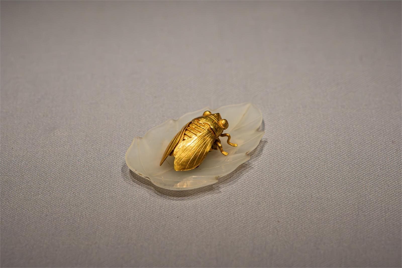 金蟬玉葉是南京博物院的鎮(zhèn)院之寶之一,是500年前貴族女子發(fā)髻上的一件時尚單品。在《玉潤中華——中國玉器的萬年史詩圖卷》大展上,它也是“網(wǎng)紅文物”之一。形神畢肖、金光閃耀的蟬棲憩在玉葉上,它嘴巴微張好似在奏鳴,玉葉葉脈分明,細薄呈凹弧狀,經(jīng)鑒定金蟬含金量達到95%,而蟬翼厚度僅為0.2毫米,工藝精致且繁復。