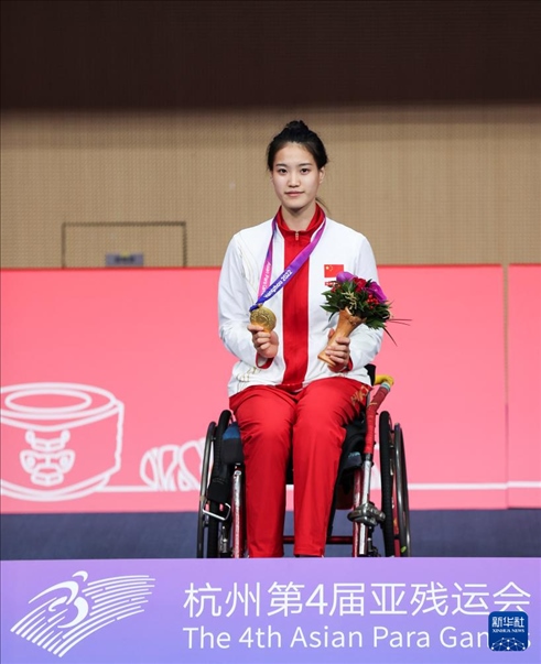 圖為2023年10月23日,中國選手辜海燕在杭州第4屆亞殘運(yùn)會(huì)輪椅擊劍項(xiàng)目女子花劍個(gè)人頒獎(jiǎng)儀式上。新華社記者 胡星宇 攝