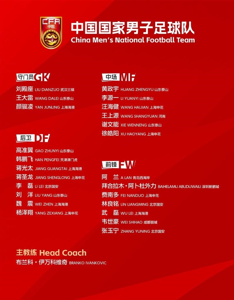以下為24人大名單:武磊、顏駿凌、蔣光太、魏震(上海海港),王大雷、劉洋、高準(zhǔn)翼、黃政宇、謝文能、李源一(山東泰山),韋世豪(成都蓉城),費南多、蔣圣龍、徐皓陽、楊澤翔、汪海健(上海申花),李磊、張玉寧、林良銘(北京國安),劉殿座(武漢三鎮(zhèn)),韓鵬飛(天津津門虎),王上源(河南),拜合拉木·阿卜杜外力(深圳新鵬城),阿蘭(青島西海岸)。