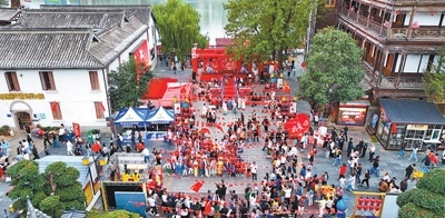 國慶假期,湖南常德河街舉辦豐富多彩的非遺文化展演活動,吸引了眾多游客。圖為十月一日拍攝的常德河街。蔡文龍攝(影像中國)