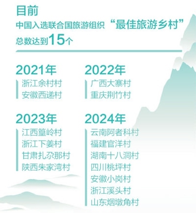 北京時間11月15日,在哥倫比亞卡塔赫納舉行的聯(lián)合國旅游組織執(zhí)行委員會第122次會議上,公布了2024年“最佳旅游鄉(xiāng)村”名單。我國申報的云南阿者科村、福建官洋村、湖南十八洞村、四川桃坪村、安徽小崗村、浙江溪頭村、山東煙墩角村7個鄉(xiāng)村入選,是本屆入選鄉(xiāng)村數(shù)量最多的國家。至此,我國的“最佳旅游鄉(xiāng)村”總數(shù)達到15個,居世界第一。