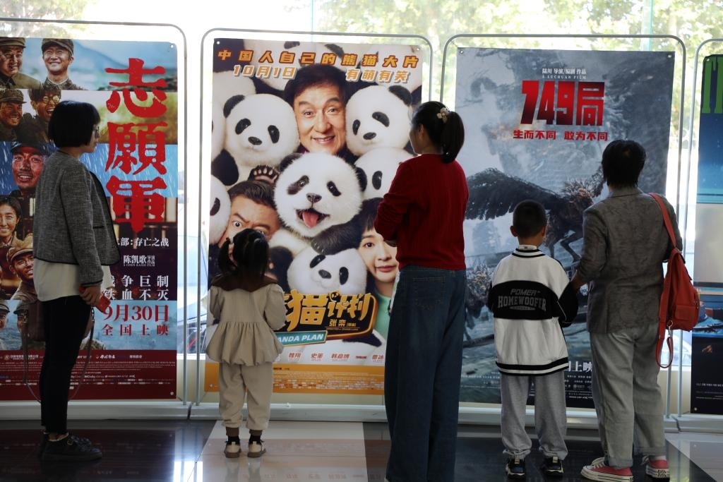 10月7日,觀眾在山東省博興縣一家影城觀看電影海報。新華社發(fā)(陳彬攝)