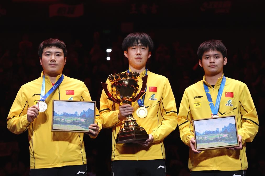 2月23日,冠軍王楚欽(中)、亞軍梁靖崑(左)和季軍林詩棟在頒獎儀式上合影。新華社記者 梁旭 攝