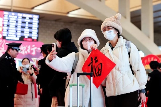 2025年鐵路春運(yùn)“萬(wàn)福迎春”活動(dòng)現(xiàn)場(chǎng),一位外籍旅客自拍留念。