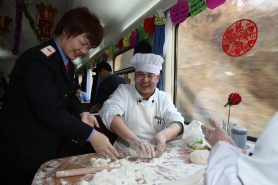 2013年除夕,北京西開(kāi)往成都的列車(chē)上,鐵路職工包餃子迎新春。