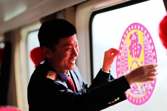 大年三十,成都至北京西的臨客列車(chē)上,一位列車(chē)員正在貼窗花。