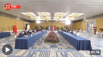 △會見現(xiàn)場的中國國旗和聯(lián)合國旗幟。(總臺央視記者荊偉拍攝)