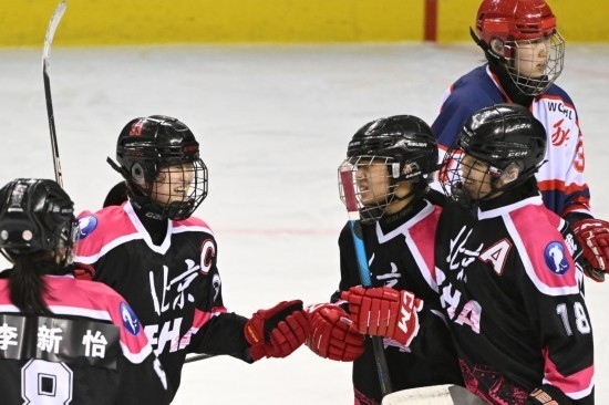 2月16日,第十四屆全國冬季運動會冰球項目女子青年組小組循環(huán)賽A組比賽中。新華社記者 鄧華 攝