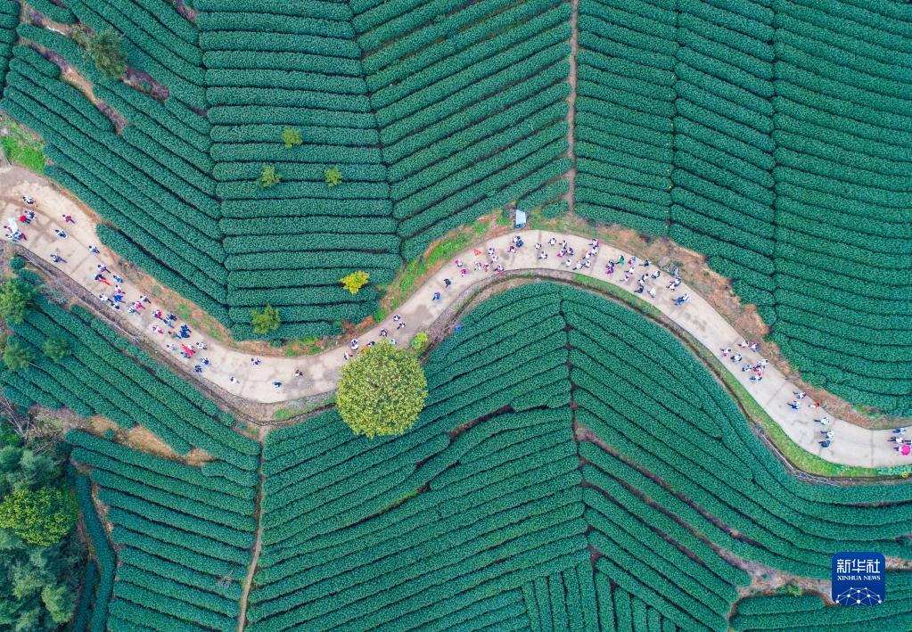 團(tuán)隊(duì)游客在杭州市富陽區(qū)拔山村萬畝茶山游覽(2018年3月26日攝,無人機(jī)照片)。浙江省“千村示范、萬村整治”工程撬動了鄉(xiāng)村從美麗生態(tài)到美麗經(jīng)濟(jì),再到美好生活的良性循環(huán)。2018年,浙江“千萬工程”獲得聯(lián)合國“地球衛(wèi)士獎”中的“激勵與行動獎”。新華社記者 徐昱 攝