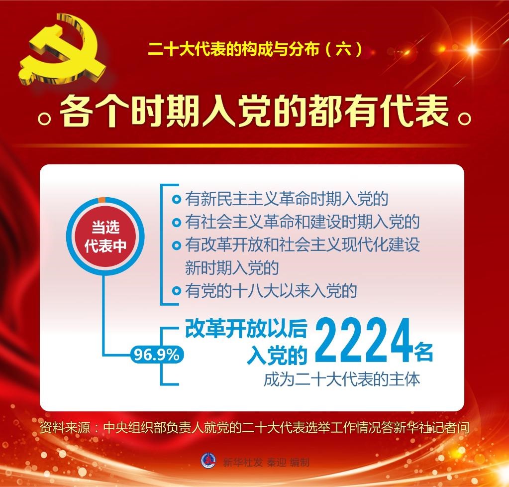 六是各個時期入黨的都有代表。當(dāng)選代表中,有新民主主義革命時期入黨的,有社會主義革命和建設(shè)時期入黨的,有改革開放和社會主義現(xiàn)代化建設(shè)新時期入黨的,有黨的十八大以來入黨的。其中,改革開放以后入黨的2224名,占96.9%,成為二十大代表的主體。