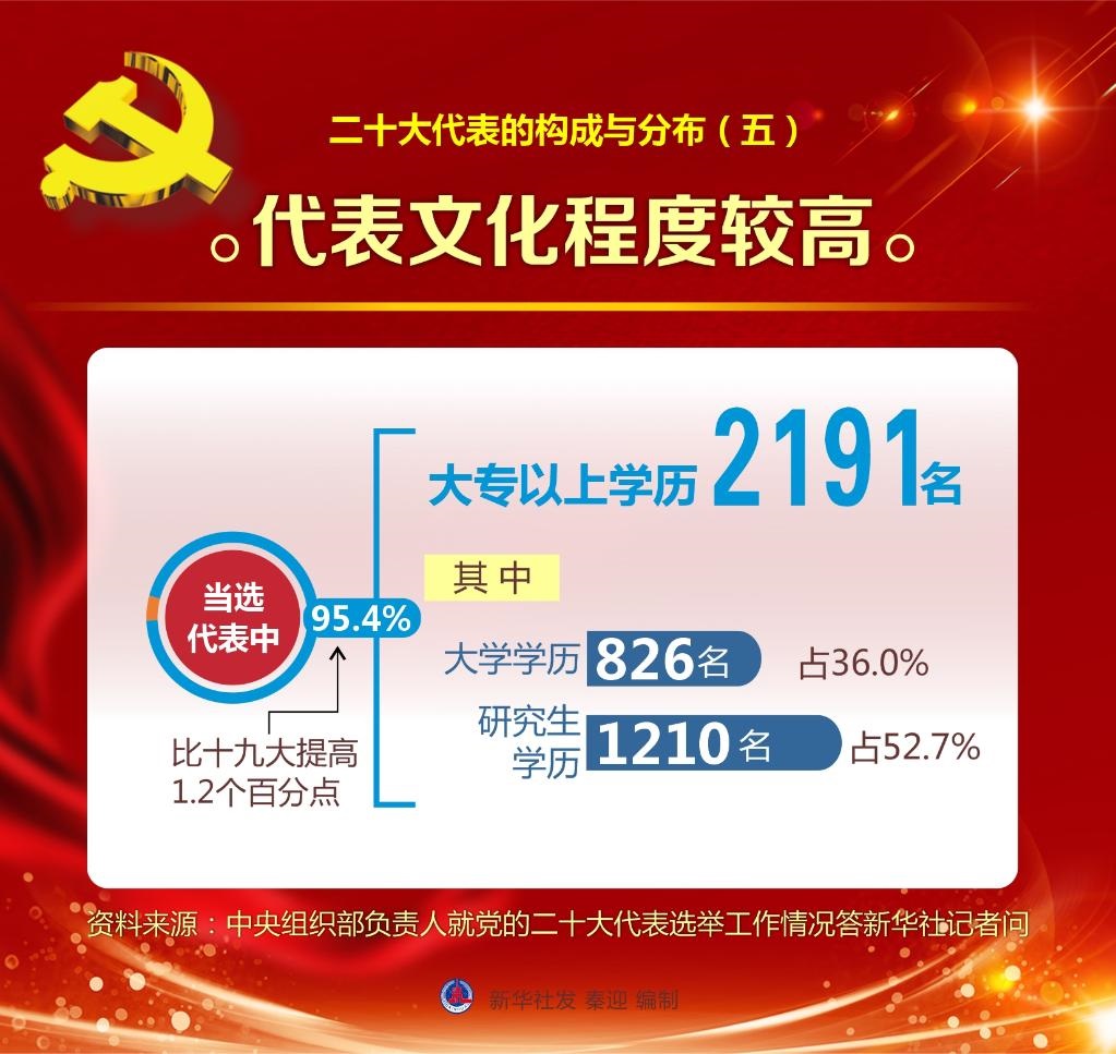 五是代表文化程度較高。當(dāng)選代表中,大專以上學(xué)歷的2191名,占95.4%,比十九大提高1.2個百分點。其中,大學(xué)學(xué)歷的826名,占36.0%;研究生學(xué)歷的1210名,占52.7%。