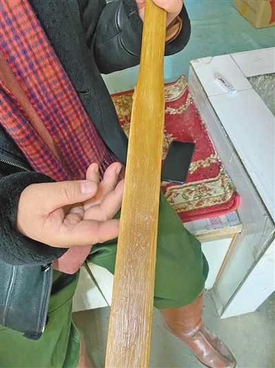 “用彈性很好的竹子或木頭作為弓胎,制作弓里的牛角一般是水牛角,或者巖羊角也可以,貼在弓外的牛筋來自春天的牛,這時(shí)候牛比較瘦,牛筋油脂少、有彈性。膠則是用魚膘、魚皮、豬皮、馬皮等熬制的膘膠,最外面還要貼一層蛇皮或者樺樹皮,防止受潮?!敝Z敏朝魯說。