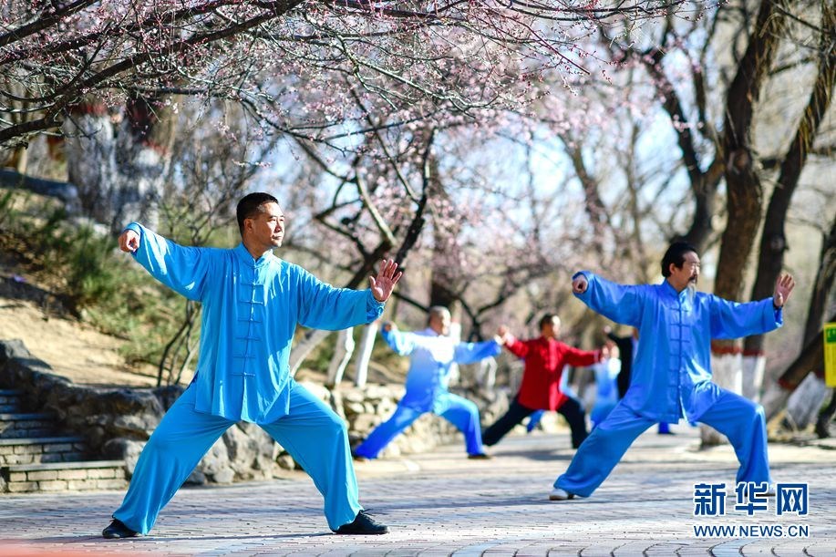 4月3日,健身愛好者在呼和浩特市滿都海公園的桃花樹下練太極拳。新華網 發(fā)(王正 攝)